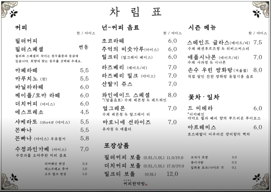 A. 시즌·재료 상황에 따라 표기·구성이 달라질 수 있습니다. 방문 시 따뜻한 블렌딩 티(쌍화차 스타일) 또는 목관리용 티로 문의해 보세요. - Q. 예약이 가능한가요?
