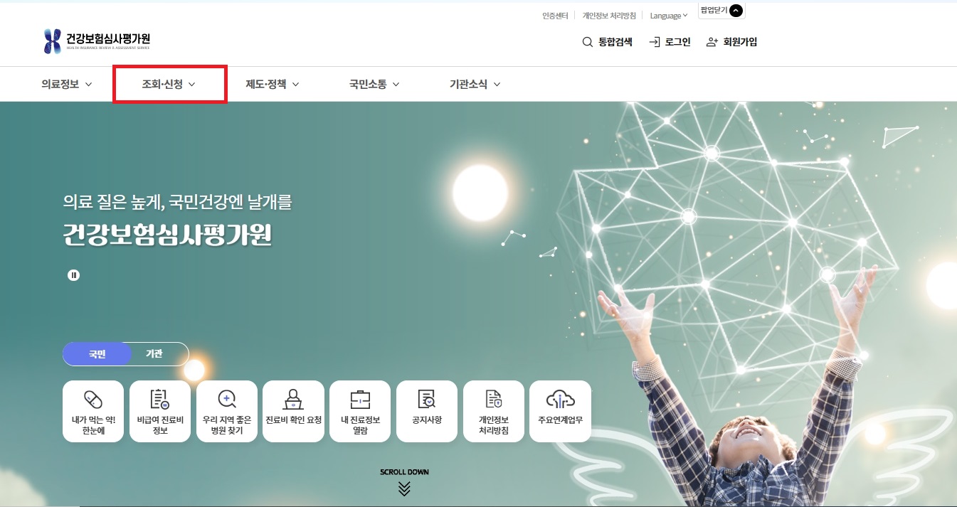 먼저 https://www.hira.or.kr에 접속합니다. 메인 페이지에서 ‘비급여 진료비 정보’ 메뉴를 클릭하세요.