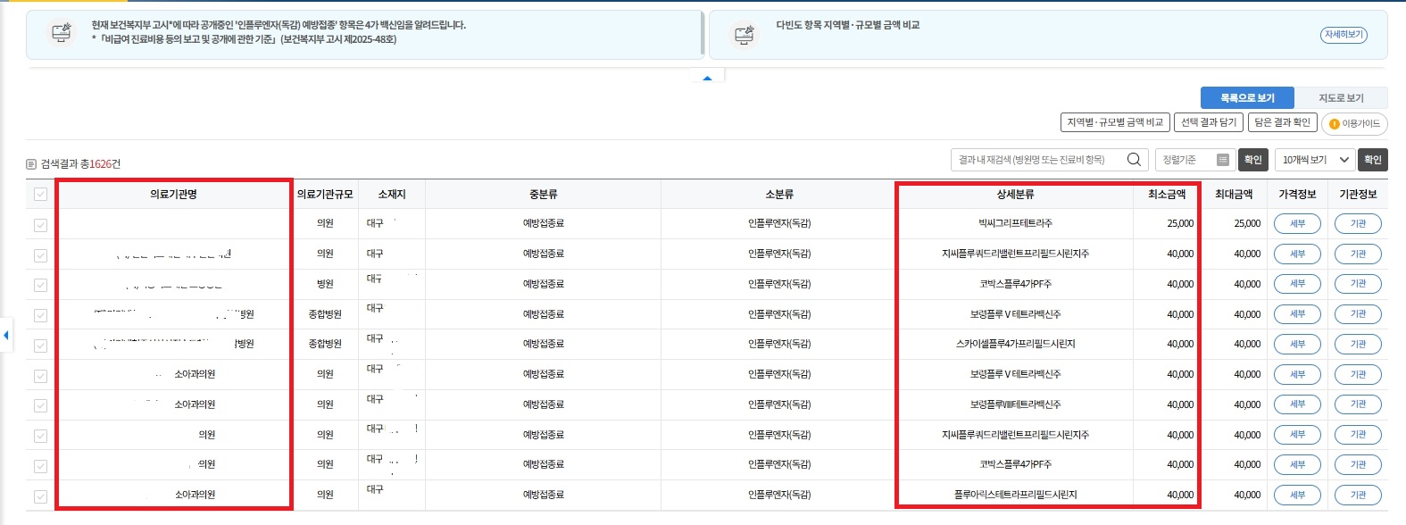 검색 결과에서 ‘예방접종료 - 인플루엔자(독감)’을 선택하면, 해당 지역 병원들의 접종비용이 자동으로 나열됩니다.