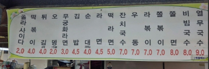 - 대표 가격 : 무궁화라면 3,000원 / 라볶이 7,000원 / 김밥 4,000원 / 튀김 4,000원