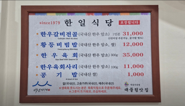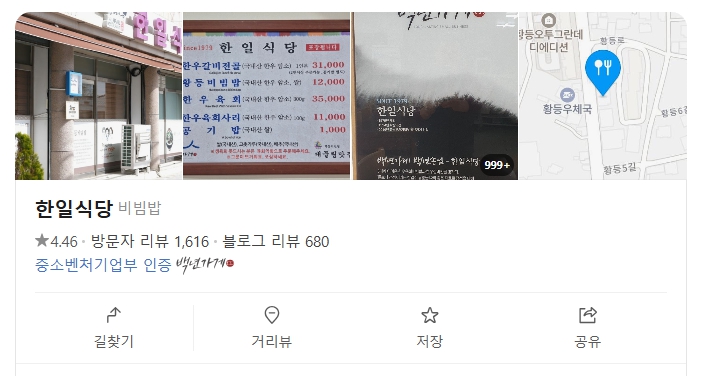 상호 : 한일식당 (중소벤처기업부 인증 백년가게)