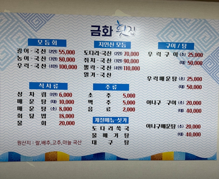 - 광어(국산) 2인 55,000원 / 농어(국산) 3인 80,000원 / 우럭(국산) 4인 100,000원