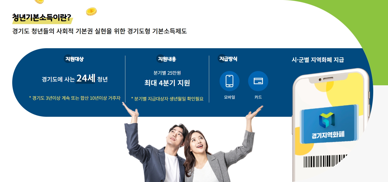 ‘경기도 청년기본소득’은 경기도에 3년 이상 계속 거주하거나, 합산 10년 이상 거주한 만 24세 청년에게 기본소득을 지급하는 경기도 대표 청년정책입니다. 노동소득 여부나 구직 상태와 관계없이 청년의 기본권 보장을 목적으로 설계되었습니다.
