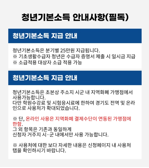 청년기본소득은 경기지역화폐로 지급되며, 주민등록 주소지 기준 시·군 내 지역화폐 가맹점에서만 사용할 수 있습니다. 단, 2025년 9월 10일 이후부터는 학원 수강료·시험 응시료 결제에 한해 경기도 전역 및 온라인 가맹점에서도 사용 가능합니다.