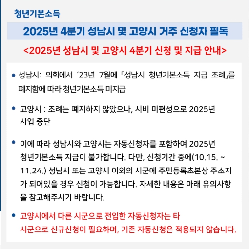 2025년 10월 15일부터 경기도 청년기본소득 4분기 신청이 시작됩니다. 경기도에 거주하는 만 24세 청년이라면, 별도의 소득 조건이나 자산 기준 없이 분기마다 25만 원씩, 1년 최대 100만 원의 지역화폐를 받을 수 있는 제도입니다. 특히 이번 4분기는 올해 마지막 신청 기회로, 11월 24일(월) 오후 6시까지 온라인으로 접수 가능합니다.